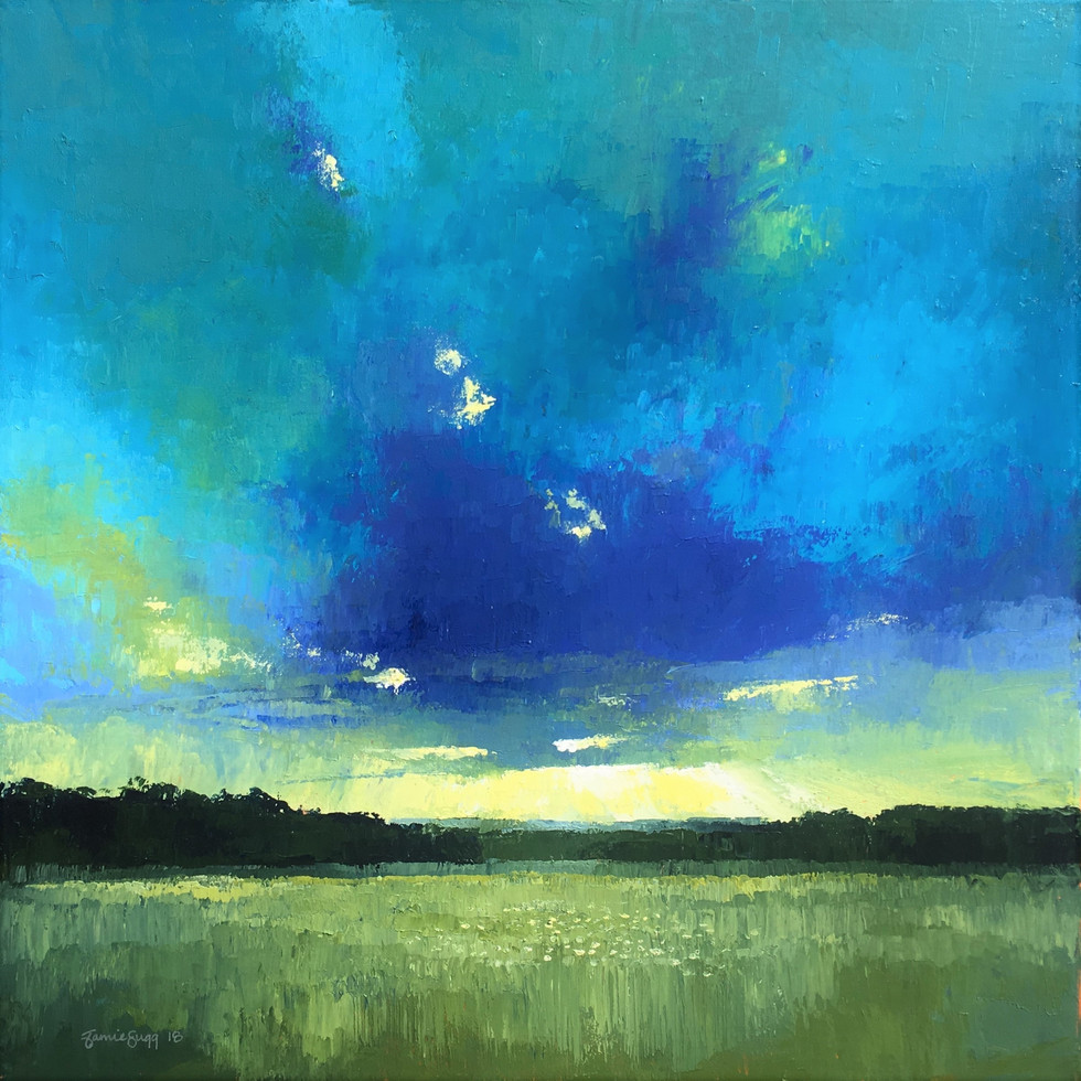 Living on the edge of the Fens in Cambridgeshire, Jamie is surrounded by the beautiful vast never-ending skies which are the source of his inspiration. The interaction of light on the flat landscape and the movement of clouds across the sky, combined with an endless search for mark-making and vibrancy, Jamie creates works of bold colour, strong that they capture every aspect of the landscape.